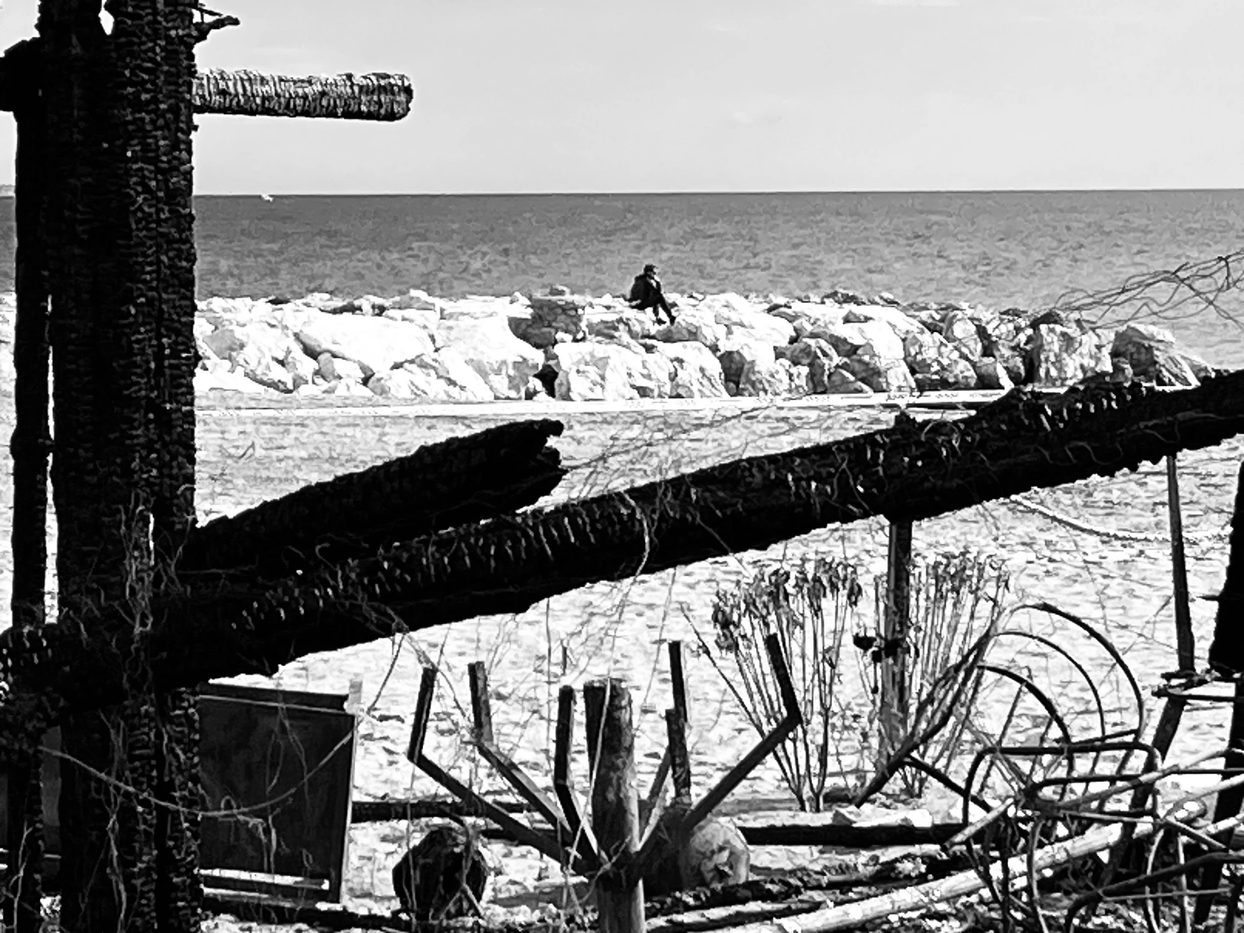 La présence du bord de mer est aussi une matière. Venir interroger la mer est une façon de retourner aux origines et d’essayer de comprendre ou plutôt d’éprouver ce que je fais là, dans ce moment, ici, face à cet élément liquide et sous ce ciel.